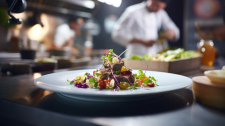 A dynamic scene of a chef plating a gourmet dish in a restaurant kitchen, with precision and care in the presentation, showcasing the artistry of cooking.