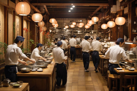 Japanese chefs preparing food in the kitchen of a restaurant in Japan.