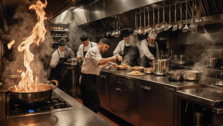 A bustling restaurant kitchen scene with chefs preparing food, flames leaping from a pan, and stainless steel equipment under bright lights.