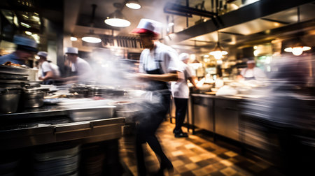 Generative AI, busy chefs working on the restaurant kitchen in motion blur, speed photo