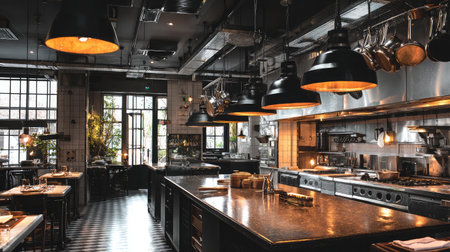 A contemporary restaurant interior featuring industrial design elements, warm lighting, and a cozy atmosphere that enhances the culinary experience.
