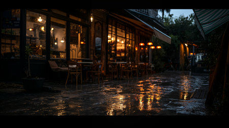 A welcoming cafe features wooden furniture, glowing light fixtures, and large windows. The scene captures a serene moment in the evening twilight.