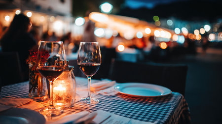 View of a set dining table outdoors at night, featuring two stemmed glasses filled with a deep red beverage, illuminated by a small glass lantern with a warm burning candle. The table is covered with a blue and white checkered tablecloth, and an empty white plate rests to the right. The background is softly blurred, showing warm artificial lights and indistinct silhouettes of people enjoying an evening atmosphere.