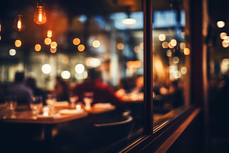 Blurred view of a vibrant, contemporary high end restaurant interior at evening, with patrons dining at tables and city lights visible through large windows, creating a sophisticated ambiance.