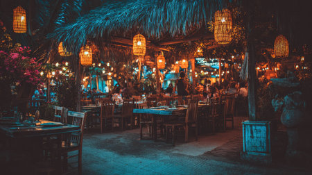 Restaurant interior showcases colorful lanterns and wooden tables, creating a cozy ambiance for dining and socializing with friends and family in a lively setting