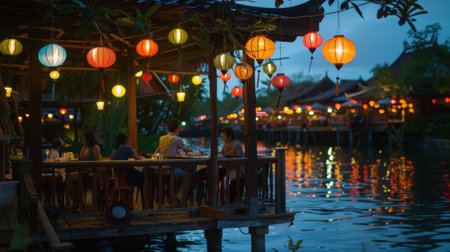A wooden pagoda adorned with colorful lanterns houses a group of diners feasting on traditional dishes as the gentle lapping of the lagoon can be heard in the background
