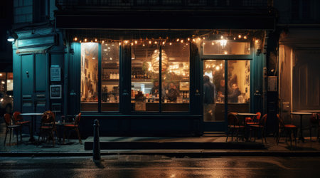 Cafe and restaurant at night. Bokeh lights in the background.