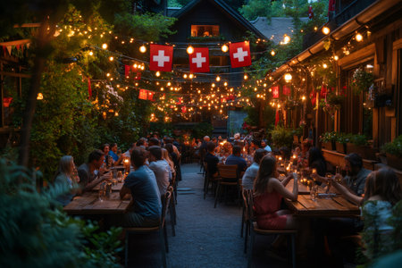 Large group of tourists enjoying dinner at long wooden tables in an outdoor traditional Swiss restaurant with Swiss flags and string lights at night