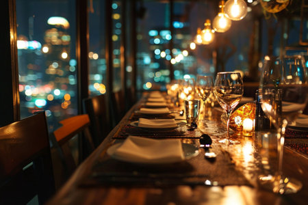 Futuristic elegant dinner table arrangement with a stunning illuminated city light and night sky landscape view at luxury restaurant. Love, romance date on vacation concept
