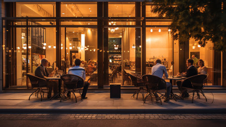 People are enjoying a calm evening at a cafe, surrounded by warm lights and a relaxed atmosphere, creating a cozy setting for conversations.