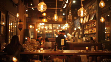 An intimate cafe setting with soft pendant lighting casting a warm glow over patrons and rustic decor