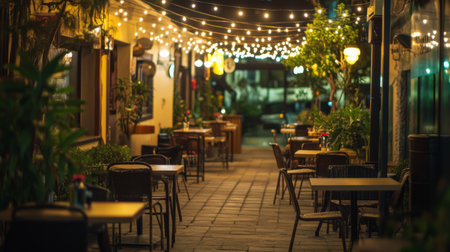 A cozy outdoor cafa with string lights overhead, casting a warm and inviting glow on tables and chairs, creating a charming nighttime dining experience.