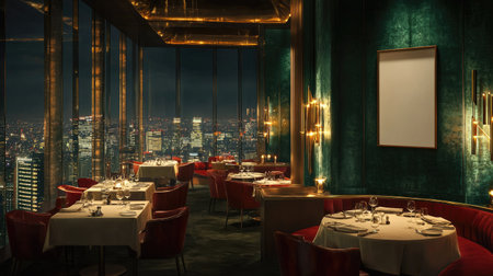 Blurred scene inside a contemporary high end restaurant during the evening. Patrons are dining at tables with city lights visible through large windows, creating an elegant ambiance.