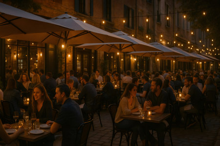 Lively atmosphere at an outdoor restaurant patio, illuminated with string lights and candles, as people enjoy dinner and conversation