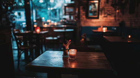 A cozy table with a flickering candle creates a warm ambiance in a dimly lit restaurant, perfect for intimate dinners or social gatherings.