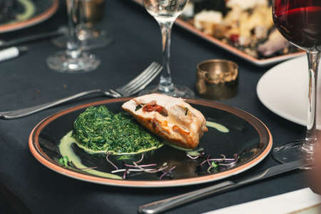 Baked chicken breast with creamy spinach on a dark ceramic plate. Comfort food in a restaurant.