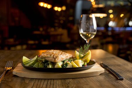 Salmon fillet with gratinated potatoes, leek and spinach on the table with glass of white wine
