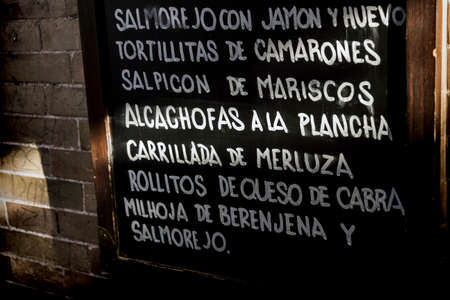 Traditional Andalusian food, slate written typical dishes Meditarranea cuisine in Seville