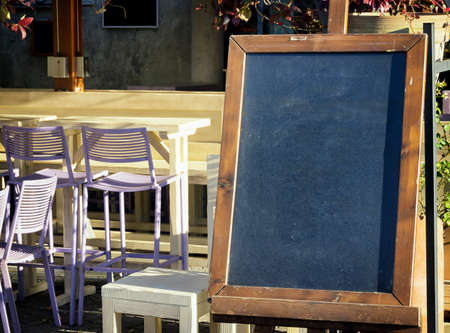Empty menu board on table in outdoor cafe