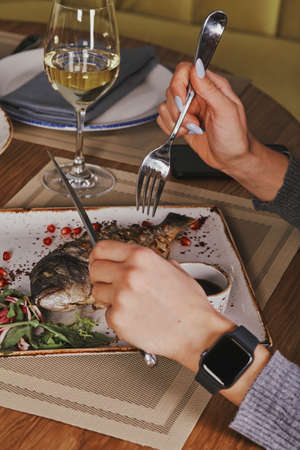 A dinner process on a white tablecloth background. A plate with seafood, a dinner service and a glass of wine in female hands.