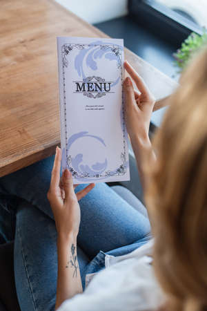 cropped view of blurred woman holding menu in restaurant