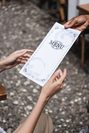 Cropped view of african american waitress holding menu near client n terrace of cafe