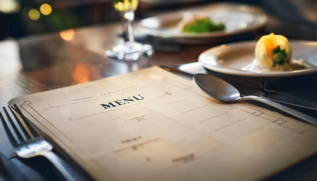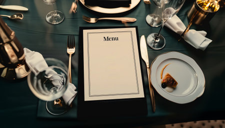 A beautifully designed restaurant menu is placed on a table, showcasing a stylish dining atmosphere with gourmet dishes presented.