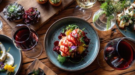 A stunning gourmet dining setup featuring a succulent lobster dish, artfully garnished with herbs and vibrant flowers, paired with fine red wine.