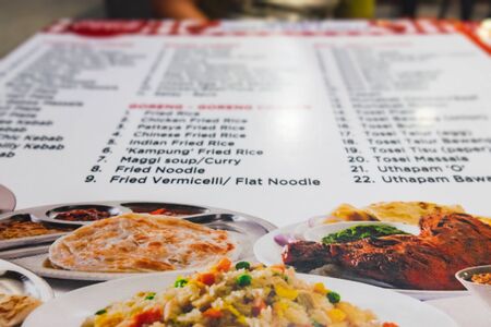 Langkawi, Malaysia - February 13, 2016: Photo menu of local beach restaurant with popular dishes from Indian cuisine, Langkawi island, Malaysia