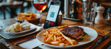 Contactless services at a restaurant, ordering and paying via smartphone, focusing on efficiency and safety, modern and hygienic.