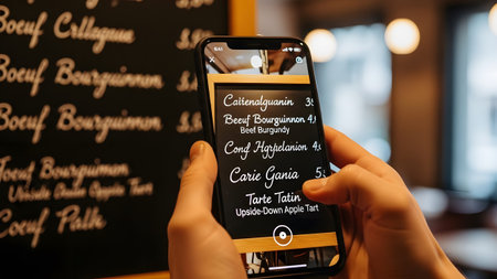 Hand holding smartphone scanning a chalk menu board with AR overlay showing food items. Clear det...