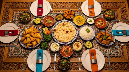 Top view of an empty South Asian restaurant table, neatly arranged with tableware, with space for copy text.