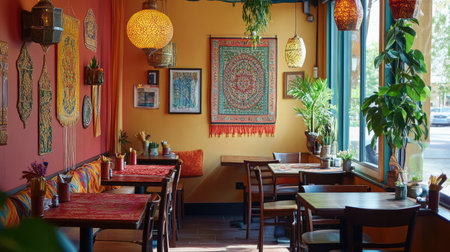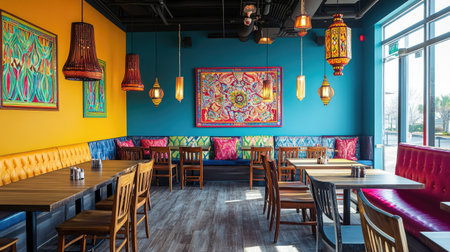 Contemporary South Asian cafe with cozy indoor seating and vibrant decor elements. No people, copy space available