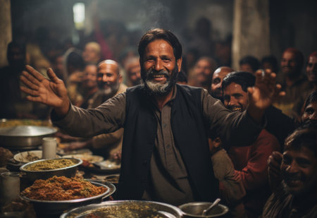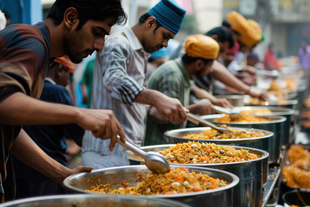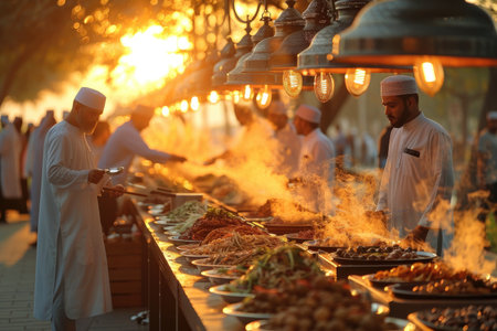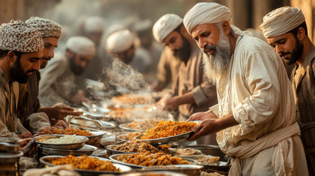 Muslim volunteers distribute steaming plates of food those in need during outdoor iftar gathering. atmosphere reflects generosity and community spirit during Ramadan.