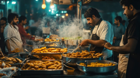 A busy Indian street food stall, with chefs frying snacks like kachori and vada pav, surrounded by eager customers.