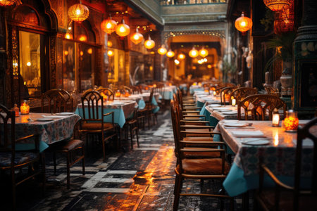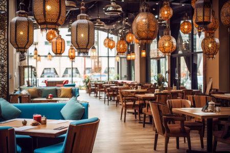 A cozy interior of an Arabic cafe or restaurant, decorated with Arabic lamps, reflecting the festive spirit of the holy month of Ramadan, offers a fusion of traditional charm and contemporary comfort.
