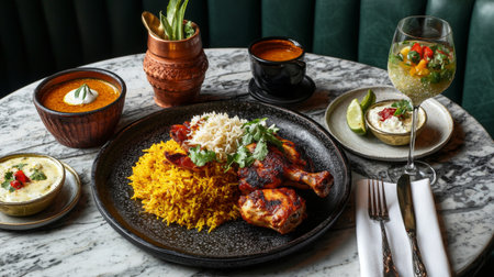 An exquisite display of Indian cuisine showcasing grilled chicken served with saffron rice, lentil soup, yogurt dip, and colorful salad, perfect for food lovers.