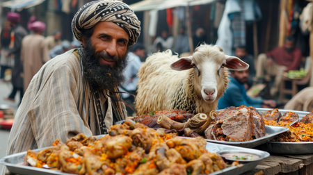 Portrait of a Male seller and a sheep in the market. The Eid al-Adha Mubarak holiday, which is celebrated after the completion of the annual Hajj. The Feast of Sacrifice.