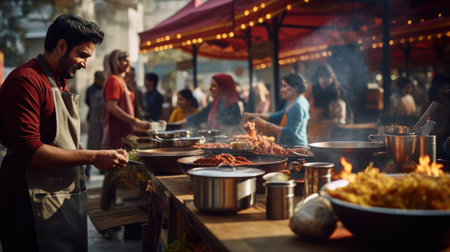 A photo set in a bustling market offering a variety of global cuisines, where chefs and food enthusiasts of different ethnicities share their culinary traditions, celebrating diversity through food.