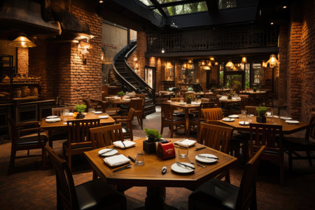 Empty dining tables in a chic South Asian restaurant, with plenty of space for text or promotional content