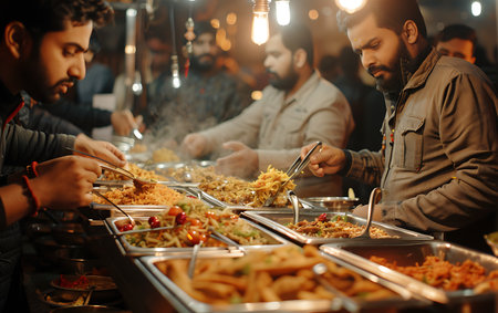 A lively celebration scene featuring a buffet table with an array of Indian dishes and a centerpiece of freshly made rotis, highlighting the festive spirit of communal dining.