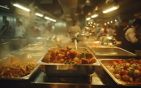 Hot and tasty food in the kitchen of a restaurant or hotel.