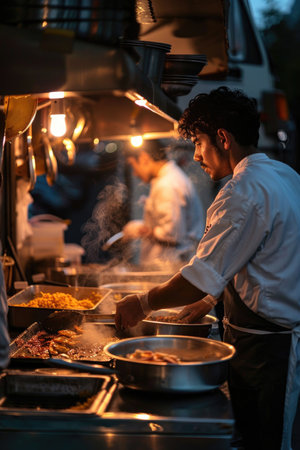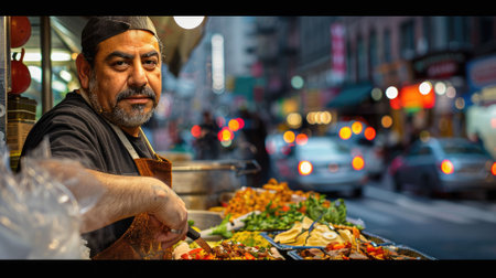A man skillfully preparing food at a busy street food stall, with colorful dishes and a bustling environment. The image captures the essence of street food culture.