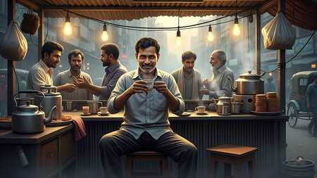 Happy Indian man drinking coffee in a coffee shop. 3D rendering