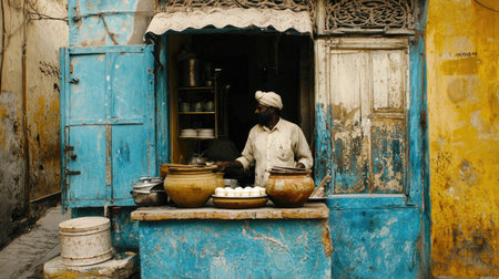 A traditional street food stall in India, showcasing a vendor cooking with vibrant blue walls and pots. Experience the rich culinary heritage of local cuisine.