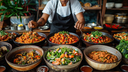 A chef garnishes an array of Thai dishes with fresh herbs, showcasing the rich and vibrant cuisine in a kitchen setting.