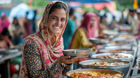 Indian smiling girl volunteer serving langar dish on the street on Baisakhi holiday, idea of spirit of mutual help