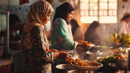 muslimah Women preparing dish for celebrate eid al-fitr in the kitchen. AI Generative
