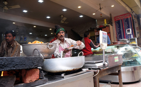 Street food vendor makes fried snacks in Pushkar, India on February 18, 2016.