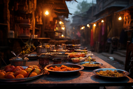 AI Generative Diwali traditional Indian food dishes on table, curries, rice, and sweets, decorative background